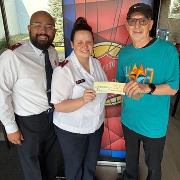Ed Bates (right) presenting check to Scott and Allison Rodriguez, Salvation Army Lieutenants..