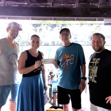 Ed Bates (center right) presenting check to Rachel Lindsey, Board President as well as Coaches Jeremy Lindsey (left) and Kenny Nally (right).